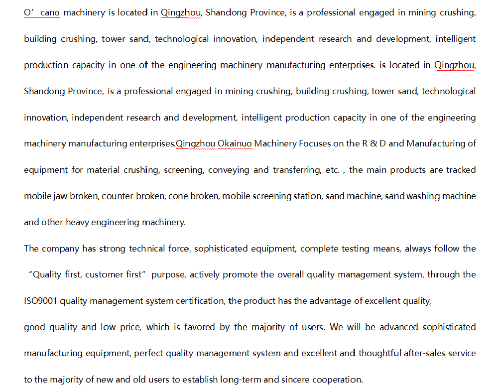 山東奧凱諾機械坐落于山東青州,是一家專業(yè)從事礦山破碎、建筑破碎、塔樓制砂、科技創(chuàng)新、自主研發(fā)、智能化生產(chǎn)能力于一體的工程機械制造企業(yè)。青州奧凱諾機械專注于物料破碎、篩分、輸送、轉(zhuǎn)運等設(shè)備的研發(fā)與制造,主要產(chǎn)品有歐版鄂破,歐版反擊破;圓錐破,歐版給料機,歐版水平篩,歐版斜篩,履帶式破碎站,履帶式篩分站等大型礦山機械。